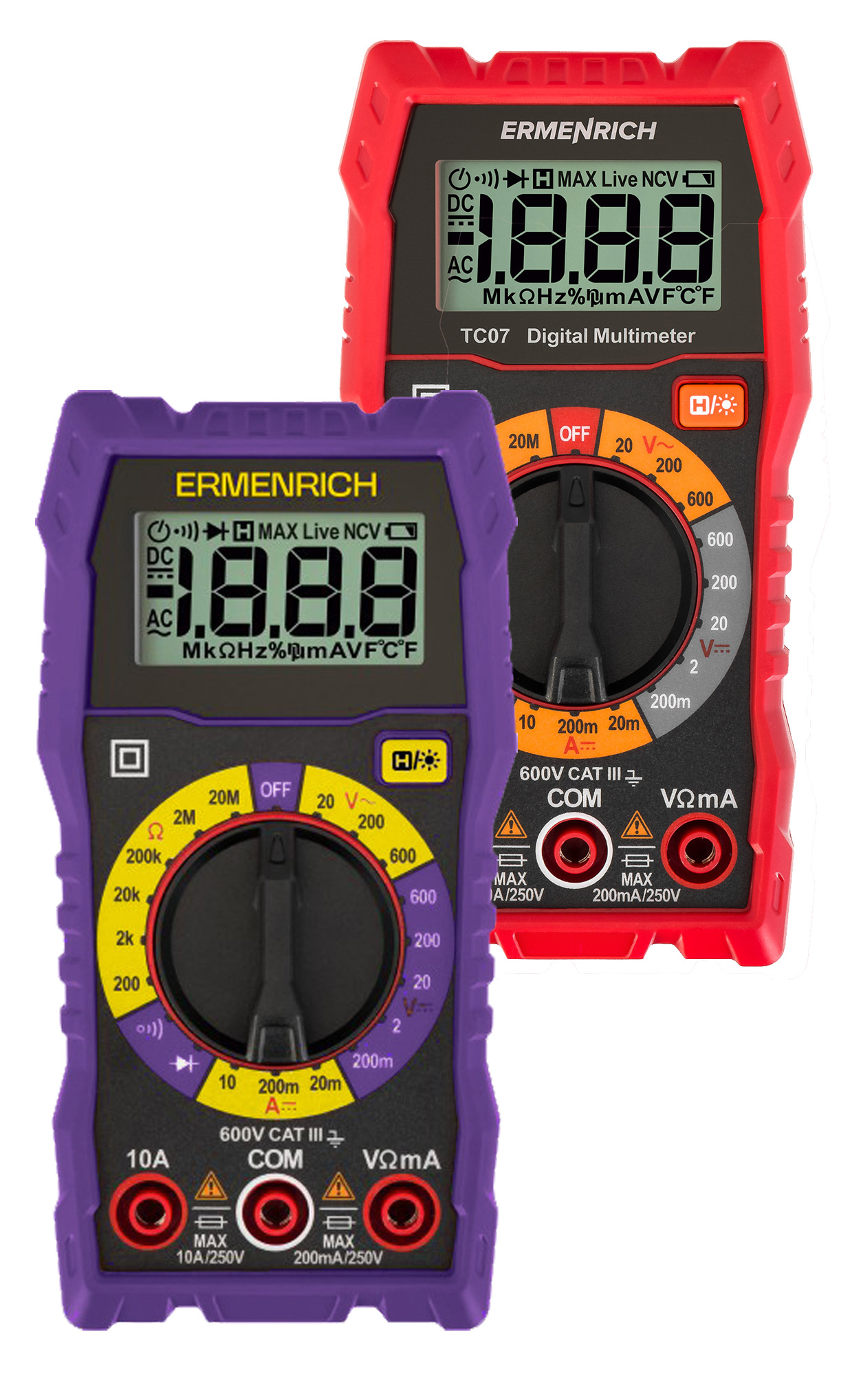 The Ermenrich Zing TC07 digital multimeter with a classic rotary switch is designed to measure DC and AC voltage, DC current, and resistance. Its functionality is sufficient for performing most tasks at home as well as for taking basic measurements in the work of a professional electrician.