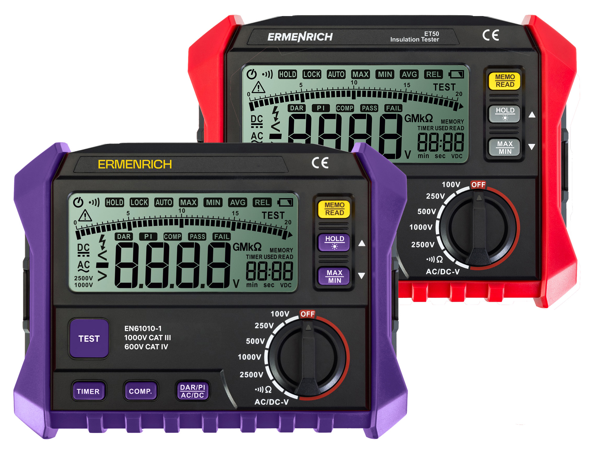 Ermenrich Ping ET50 is an insulation resistance meter, or megohmmeter, which is used to check the quality of cables. Damage or deterioration of the insulation on a live cable can lead to short circuits and fires. Regular megohmmeter inspection reduces the risk of such dangerous situations occurring. The device operates at 5 test voltages: 100, 250, 500, 1000, and 2500V. The total resistance measurement range is from 0 to 200GΩ.