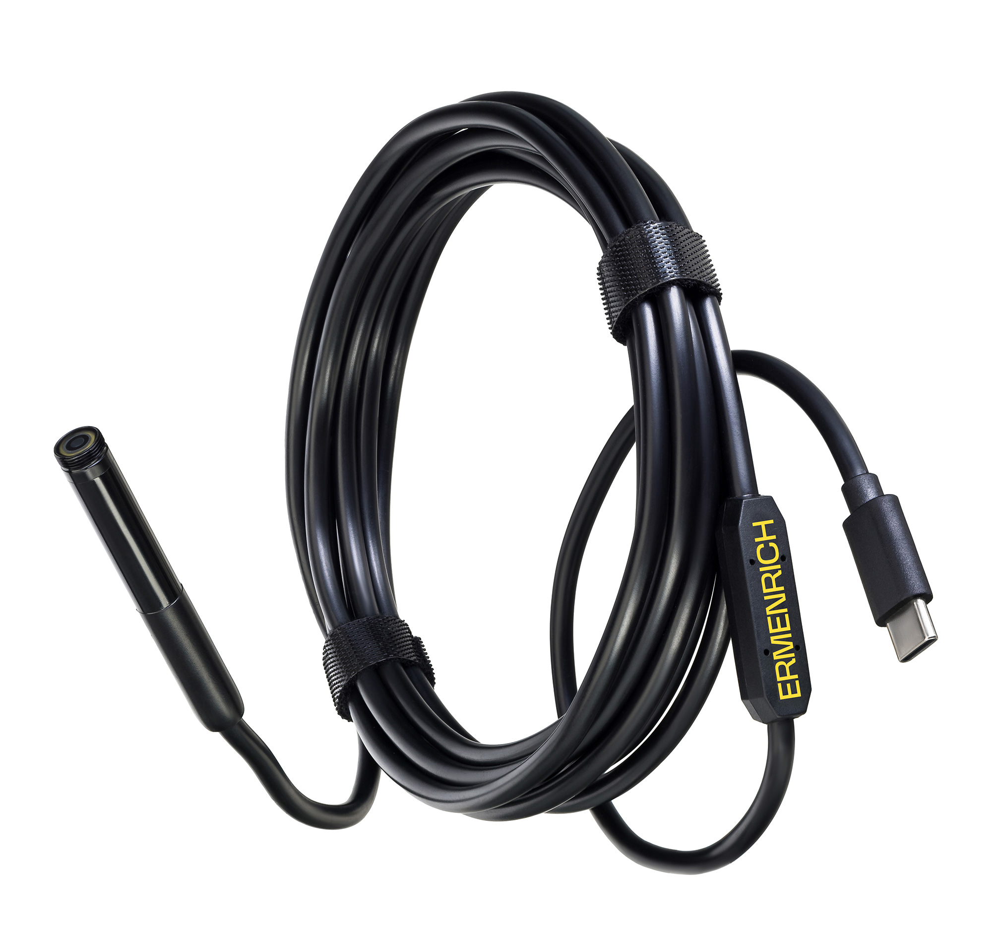 The Ermenrich Seek VE10 industrial endoscope is a modern tool for the visual inspection of hard-to-reach places when diagnosing the condition of buildings and checking repair quality. It allows you to easily assess the appearance and reliability of ceilings as well as ventilation shafts and pipelines, and to check the communications installation, detect repair defects, voids, leaks, etc. The endoscope does not require opening up walls or dismantling any finishing touches. It has a flexible 3m probe that fits any narrow opening (the tip diameter is only 7.9mm), resulting in significant time and cost savings for the user.
