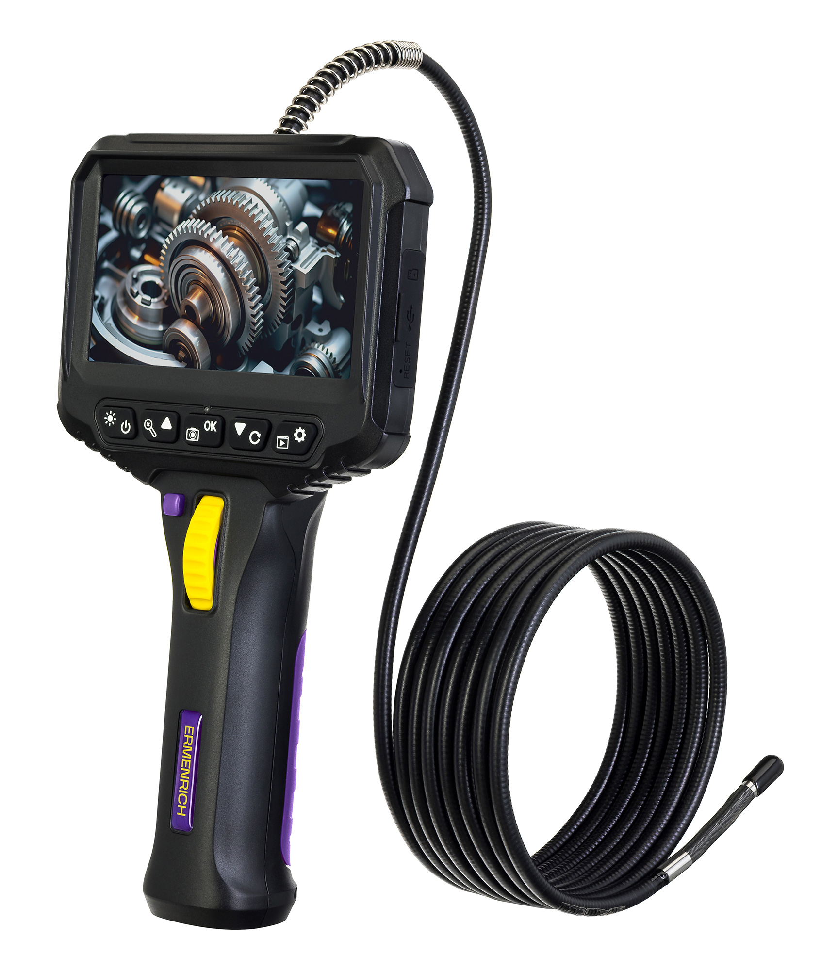 The Ermenrich Seek VE80 Industrial Endoscope is a multifunctional professional tool featuring a rotating camera with a 90° view and a small diameter of only 6.2mm. The borescope is used to monitor the quality of repair and construction work, check the general condition of premises, and search for sources of dampness, mold, and freezing. Thanks to the flexible and thin probe, the user can easily examine any hard-to-reach cavity or utility (electrical wiring, pipes, shaft, etc.) within a wall. Cable length: 3 meters. For operation in complete darkness, the endoscope is equipped with a backlight consisting of six bright LEDs located around the camera lens.