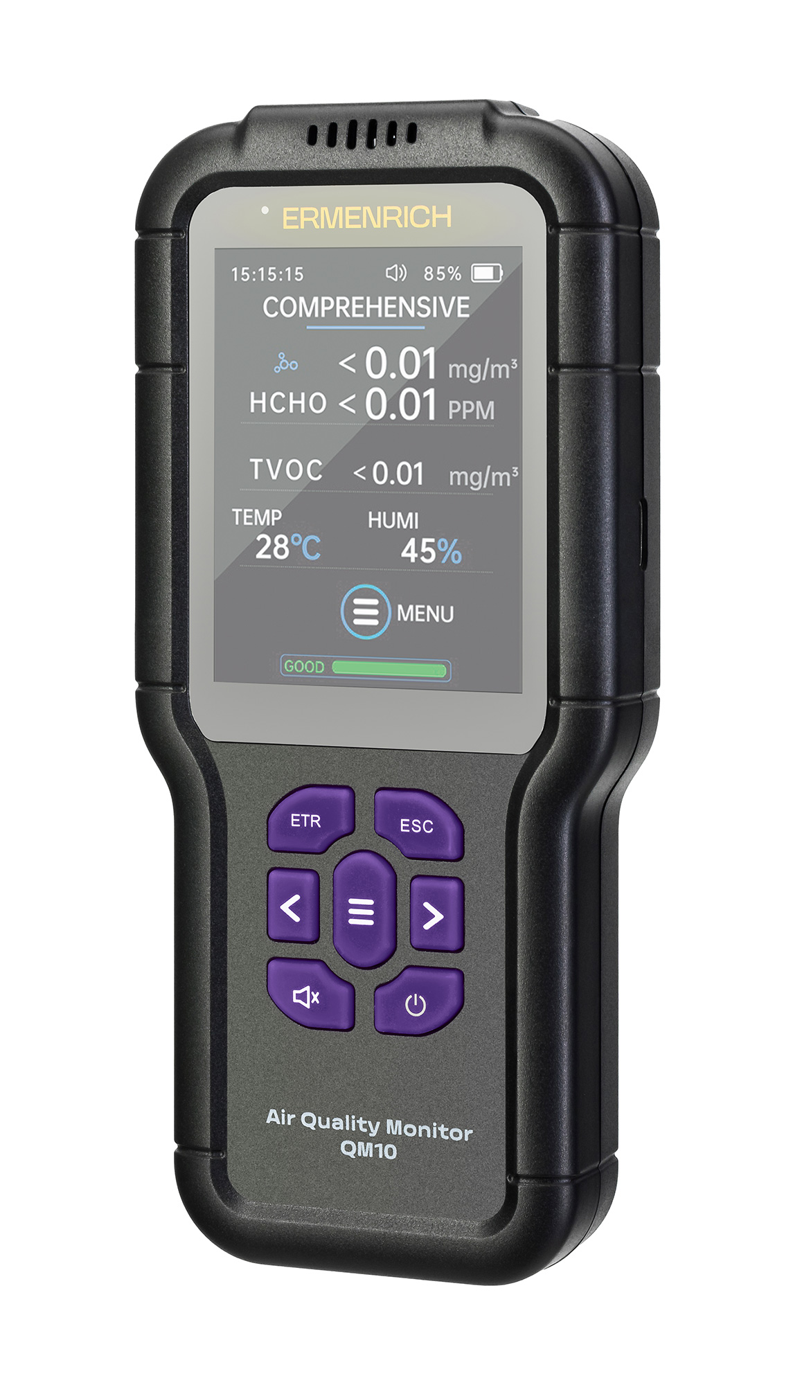 The Ermenrich QM10 Air Quality Monitor is a handheld instrument for analyzing indoor air composition, detecting elevated levels of harmful substances, and monitoring the microclimate. It can be used in domestic and commercial settings – offices, hotels, schools, and kindergartens, cafes, shops, etc., but not for industrial purposes – the TVOC (volatile organic compounds) measurement range is 0.0–1